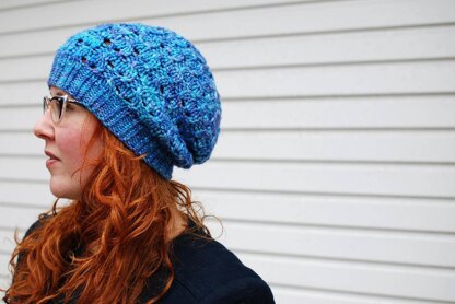 Sumptuous and soft Baby Alpaca envelope your head keeping you warm and stylish on the coldest days. The stitch pattern is truly reversible giving you two stylish hat options in one. The easy to remember eyelet pattern knits up quickly. Available in two styles (fitted and slouchy) and three sizes. Choose a bouncier yarn, like Ginger’s Hand Dyed Flumps Chunky for a less slouchy look.