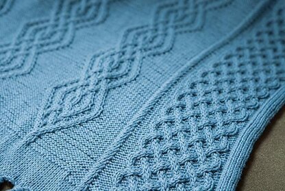 The Larkshead Throw is a generously sized rectangular throw worked flat from the short edge. Stockinette ends transition to deeply knotted fringe, while the long sides are finished with an i-cord edging.