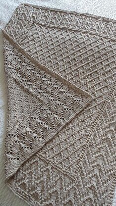 A beautiful textured blanket with a central lattice panel and chevron lace border. Knitted in one piece, with garter stitch edging.