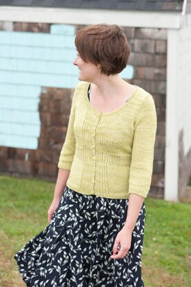 A simple yet effective and pretty twisted rib pattern is worked in vertical panels down each front and horizontally at the waist to add waist shaping. Laurens maybe worn buttoned all the way up, partially buttoned, or open.The smaller gauge allows this sweater to be lightweight and compact. It can easily be carried with you in a bag or worn under a jacket.