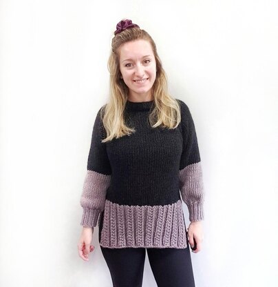 The Lavender Dip Sweater is named due to the colour blocking “dip” dye kind of look. It has a short ribbed collar and is worked top down raglan style. The sleeves and bottom edge are colour blocked and have a ribbed hem. The sleeves are a loose balloon style sleeve with a fitted ribbed cuff. The bottom hem features a split hem in beaded rib stitch, with a longer back section. The sweater is designed to fall to hip/butt level. This is a #sizeinclusive pattern.