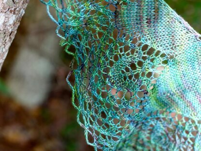 Lawsonia is the perfect little something to carry you into spring from a long winter. The Triton colorway from Socktupus is gorgeous mix of greens and blues with just a few hints of purple that is shown to best advantage by this crescent shaped shawlette with a sweet leafy edging.