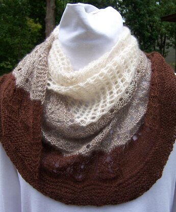 A luscious shawlette: approximately 600 yards of 100% US-raised cashmere … different techniques for increases and decreases … in natural shades of cream, taupe and brown. The rounded triangular shawlette, starts at the top and works its way down to the slightly-frilled garter border. Elegant, warm and luxurious … what more could you want this winter?