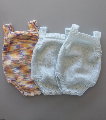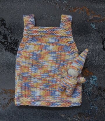 Both the romper and pinafore are knitted from the bottom up, in 2 pieces - Front & Back (the shoulder straps are included with the Front for ease) - and then the 2 parts are seamed at the sides only, and the straps joined to the top at the back.