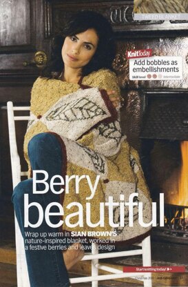 This is a pattern for a Leaves and Berries Blanket, originally published in Knit Today. It is made is squares, a cobnut stitch and leaf intarsia, sewn together and the edging done afterwards. Bobbles are sewn on when completed. Photos Knit Today.