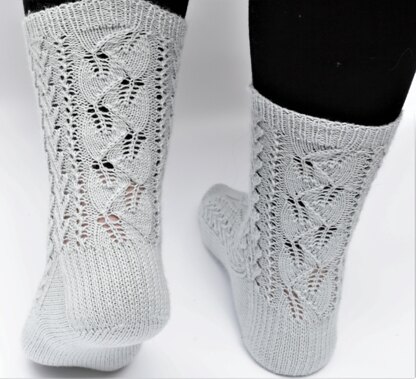 The socks are knitted top down with a classic turned heel and toe shaping. The remaining stitches are grafted together using Kitchener Stitch.