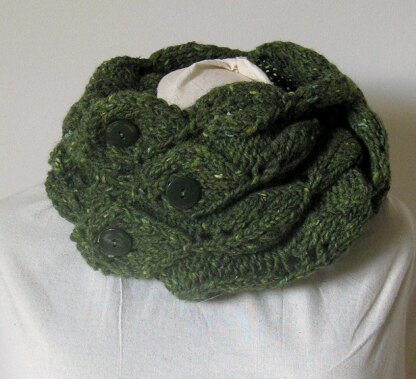 A versatile scarf with button fastening to convert into a cowl. Wear wrapped once or twice around your neck. Leave open for a wrap/stole. Worked in a pattern of large leafs in chunky yarn. Finished size after blocking: 28cm (11in) wide and 136cm (53½in) long. Original is worked in Debbie Bliss Chunky Tweed (discontinued) and can be worked in any chunky yarn with a stocking stitch tension of 12 sts to 10cm (4in). Yarn amounts: 3 x 100g hanks (300m (327yds)