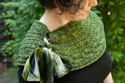 This sideways knit, round-edged cowl in three sizes features delightful leaves amidst a forest of other embellishments.