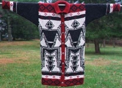 About the Design: The moment I saw this old, Pueblo frog motif, I was struck by it’s Art Deco feeling. I’ve chosen just 2 main colors to present the image, whose graphic quality is enhanced by the limited color palette! The pattern wraps around the entire coat.