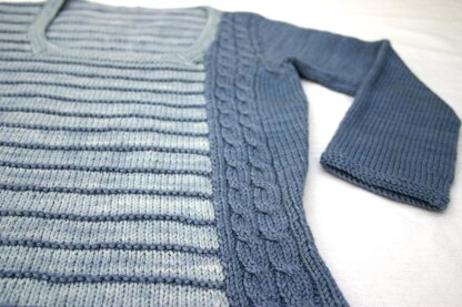 Leaps and Bounds is a pretty top featuring contrasting coloured sleeves, leaping tramlines and bounding cable patterning. It has a flattering squared-off neckline and a gentle waist shaping. An unusual sweater that offers an intriguing aspect whichever way you look at it. Mix and match yarn colours to suit your taste.