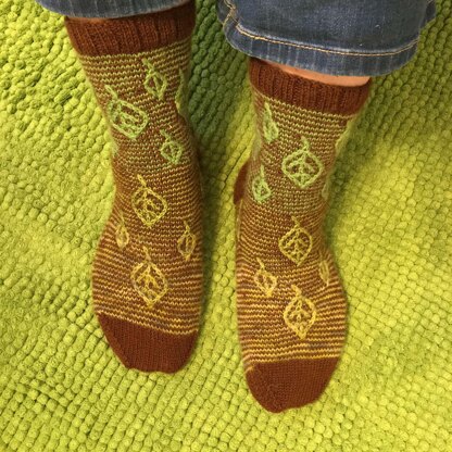 These socks will "leave" your feet toasty and warm on chilly spring mornings and evenings! They were designed to use up leftover bits of similar colored yarns as the contrast colors. A note in the pattern will indicate where the CC was changed for the sample pair.
