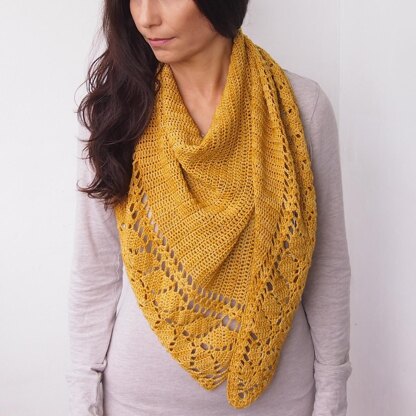 Leaves shawl is with slightly asymmetrical triangular shape. It’s fun play of lace and simple dc which will show beautifully when worn. The asymmetrical shape makes it look elegant and modern. It can be worn in a multitude of ways. Wrap it around your neck as scarf, wear it like a cowl or bandanna, or just throw it over one shoulder to give a pop of color.