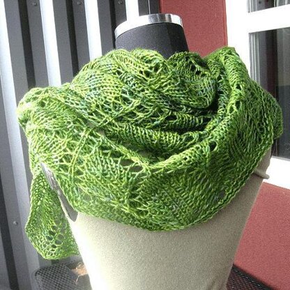 Quick to knit with just 500 yards of worsted weight yarn, this shawl is perfect for when you want a shawl without a super lacey look. Blocky leaves twine down from the center, with simple repeatable leaf motifs making up most of the knitting. The shawl is knit from the top down. Garter stitch edges the shawl to prevent curling, and the simple edging on the bottom produces subtle points.