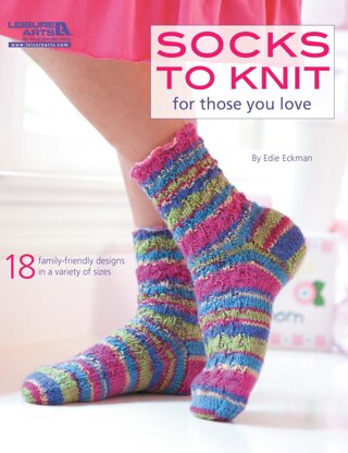 Leisure Arts Socks to Knit for Those You Love eBook- 18 family friendly knit sock designs in a variety of sizes. Warm your loved ones right down to their toes by giving them the gift of handmade socks. Designs include: bright tweed, braided cable, chevron purls, heart toe-up, eyelet toe-up, knotted rib, seed stripes, toe-ribbed, tiny toes, baby rib and more. Projects call for size 1 super fine and 3 light weight yarn, and sets of 4 double pointed knitting needles in US sizes 3 and 4. Includes step-by-step instructions for each design, helpful diagrams and a general guide to knitting. Beginner to experienced skill level. 98 pages, PDF download.