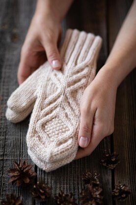 The construction of the mittens allows good anatomic fit on the hands and at the same time have just the right ease that gives free movement. The bold sculpted cables go from the cuff to the fingertips. The cuff at the lower part of the mittens is long enough to guarantee you warm hands.