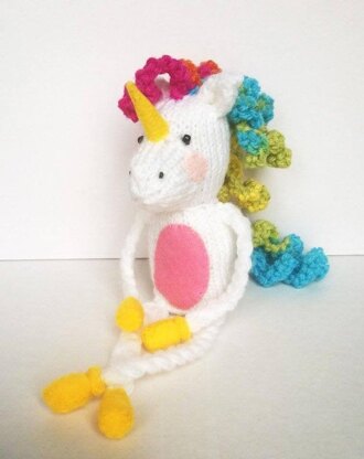 A cute and easy to follow Knitting Pattern for an adorable small Unicorn that can be knitted on smaller needles as pictured, or on larger for a slight size increase. This is the perfect little hand held companion for most children, and looks great as a shelf display for Unicorn lovers. It's made with legs and arms that are plaited so he can sit on a shelf and let his legs swing. I design all my toys myself and have been knitting since I was just a child. The Unicorn does not include a pattern for the scarf and bag pictured.