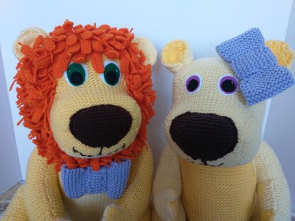 The pictures show the lions completed in Paintbox simply chunky yarn on a size 3mm knitting needle and they are approximately 18inches tall when sitting. This pattern can also be completed in Dk or Aran yarn but that will change the quantities of materials you'll need.
