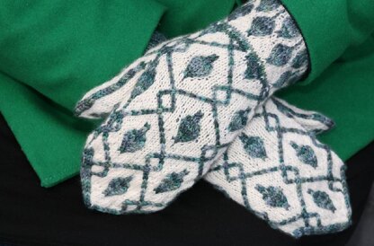 Estonian-style mittens with a peasant thumb, worked in the round. Stranded colourwork has increases, decreases, and 2-stitch cables to give a Renaissance look and velvet-like texture. Pattern includes instructions for working 2-stitch cables without a cable needle. Colourwork is charted only. Pattern is written for working in the round with 2 circular needles.