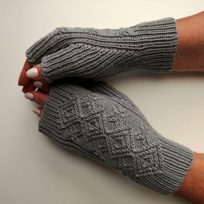 A natural fiber (merino, alpaca, lambswool, etc.) yarn should be used to knit up the mitts, which will keep its shape without stretching out. Choose light, bouncy, woolen spun yarn for the best cables.
