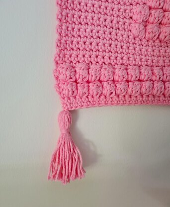 This pattern is easy for beginners too. There are full instructions included on how to make the bobbles and the tassels. The pattern contains written instructions as well as a complete crochet chart.