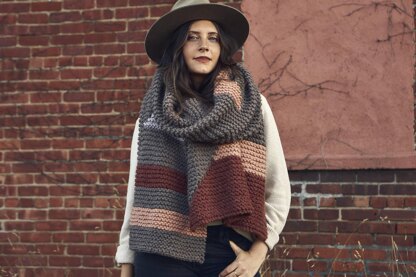 Shards of color slice into a neutral base to add drama and intrigue to this simple garter stitch blanket scarf. Cozy up under the squishy fabric by draping it over the shoulders, or go for a bold statement and wrap it around the neck like a scarf.