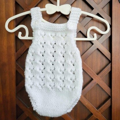 Knitting Pattern for an adorable lace pattern baby romper. This is just perfect for a newborn photo prop, or a babyshower gift, or even for you baby's first birthday! The pattern is for a legless, baby romper with all over lace pattern, and is knit in sizes from newborn photo prop, to 12 months old. The little romper is quick to knit, in an easy lace pattern. (there are only 2 rows of actual pattern, the rest is knit or purl) The romper is knit flat, in two pieces, and then stitched up the sides. Yarn required: 1 x 50g ball of double-knit yarn (Light Worsted / 8ply) Knitting needles: 4.5mm / US 7 Skills required: You need to be able to knit, purl, increase and decrease. The pattern is fairly simple, and is suitable for an intermediate knitter, or a beginner with a bit of experience.