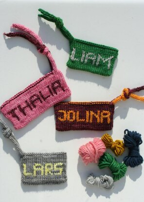 Yarn in the main color and a scrap of contrasting color for the name. I knitted with sock yarn 4ply and used between 5 and 8 grams (total) depending on the number of letters and size of the label.