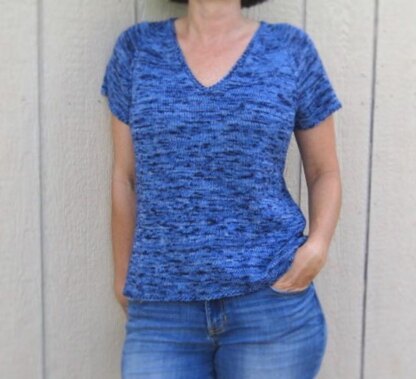 Liberty is a light, fingering weight to-down raglan knitted t-shirt that is available in 11 adult sizes. This short-sleeved V-neck summer weight sweater features a straight body and a picot styled edging created by a unique bind off method. The neckline is also finished with this same design. Perfect for indie dyed and hand painted artisan yarns, this top is light enough for air conditioning and cool weather.