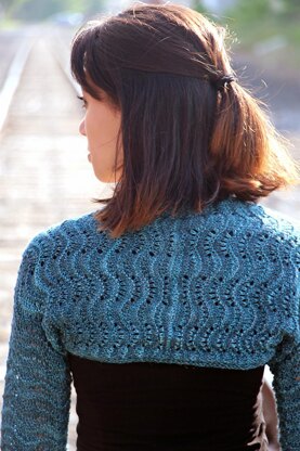 This light shrug is just the thing for fancy parties when you want something over your shoulders but a shawl is just too fiddly. It’ll also make you just feel a little special while out in jeans and a t-shirt. Either way, it’s quick and easy to work with a feather and fan pattern that hides shaping and a nice loose gauge. Block it aggressively for more drape, or barely at all for more arm-hugging shrugness.