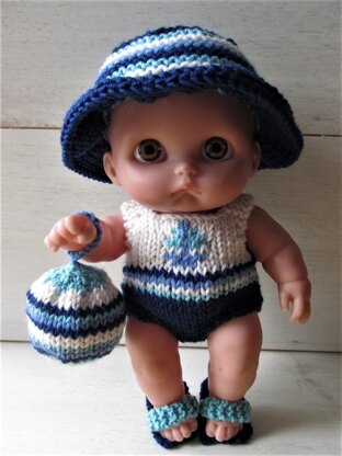 Easy to make beach set for your Li'l Cutesie doll using 3mm straight needles and DK yarn. Instructions for swimsuit with boat motif, sun hat, sandals and beach ball. A bit of fun that can be made in a couple of evenings.