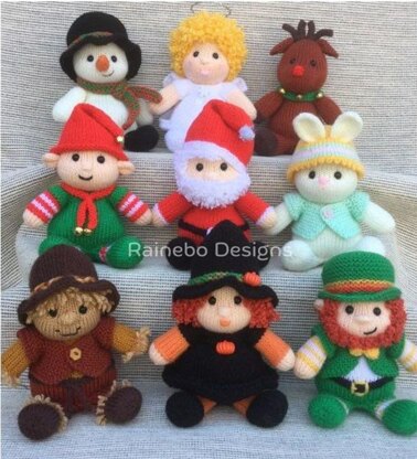 These Lil’ Hugkins-Holidays are knit in the round, using Magic Loop or double pointed needles. The legs, body, “arms” and head are all knit on as you work along. Most of the clothes are not removable. A total list of yarns and yardage for each can be found on my Ravelry pattern site.