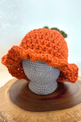 Moms, grandmas, and makers alike will love this project. It works up quickly in super bulky-weight yarn (perfect for stash-busting!) and includes four sizes (0–6 months through 10 years), making it an instant favorite for last-minute gifts or fast craft fair inventory. With two brim options — sweet ruffle or classic straight brim — and a playful trailing vine, this pumpkin bucket hat brings smiles wherever it goes.