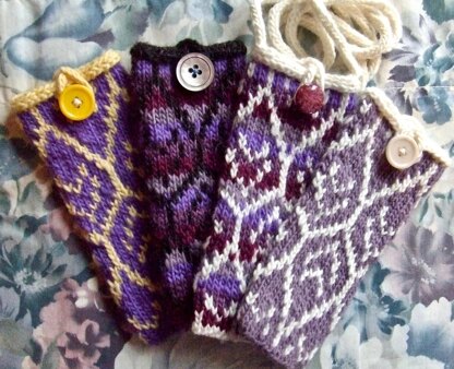 About The Design: This is the 7th in a series of knit covers for your cell phone or eyeglasses. Weigh about an oz., they make good use of all those tiny balls of stash yarns. Inspired by “Lilac Time”, a lace pattern in Marianne Kinzel’s Second Book of Modern Lace Knitting!Finished Dimensions: 3.25” wide x 7.75” longMaterials: Lamb’s Pride Worsted (LPW) with one color of Lanaloft Worsted (LLW).Samples 1 and 4: .53 oz./26 yds. LPW #M13 Sun Yellow OR LPW #M10 Creme, and .64 oz./31 yds. LPW #M100 Supreme Purple OR LLW #LL59 Lavender Cloud.Sample 2 and 3 (with cross-body strap): .53 oz./26 yds. LPW #M06 Deep Charcoal OR .91 oz./ 44 yds. LPW #M10 Creme, .21 oz./10 yds. LPW #M162 Mulberry, .21 oz./10 yds. LPW #M173 Wild Violet, .21 oz./10 yds. LPW #M100 Supreme Purple, and .14 oz./7 yds. LLW #LL59 Lavender Cloud.