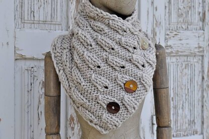 It is knitted as one piece and the corners are folded in to form a cowl and buttons are sewn to keep it all in place.