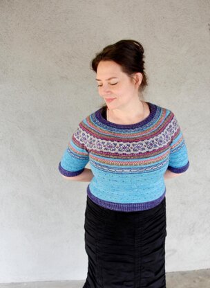 Stitches are cast on for the neck, the rib is worked, then a series of Short Rows between the charts for neck shaping. After yoke is worked, the sleeve stitches are separated from body, then the body and each sleeve is worked using written and charted instructions. All stitches are bound off and your piece is ready for blocking!