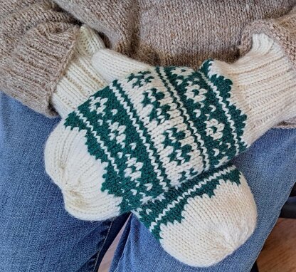 Warm and squishy adult mittens with fun and easy color work patterns. Concise and simple afterthought style thumb treatment.