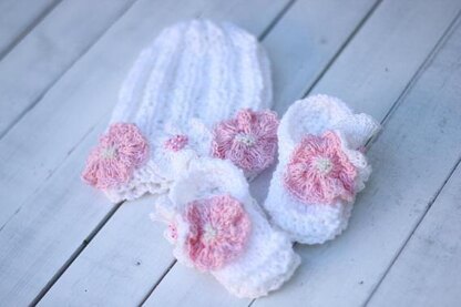 This beautiful set that includes the hat and shoes is made from Bernat baby Coordinates yarn ,weight 3, . The set is knitted ,but the flowers accents are crochet, from out Lidia Thread. The slippers are worked flat and the sole is sewn on the back only. This delicate and beautiful girlish set, will make a beautiful baby shower gift, the pattern written is to fit 0-up to almost 3 m old baby.