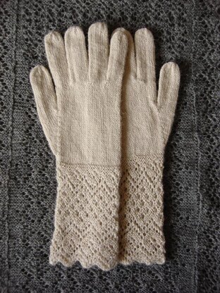 These dainty, old-fashioned gloves feature an elaborate lace edge that’s worked sideways in garter stitch. The strip of knitting is grafted into a ring to form the cuff, and the remainder of the glove is worked in the round. The soft alpaca lace yarn held double makes a thin but warm fabric, perfect for dress gloves.