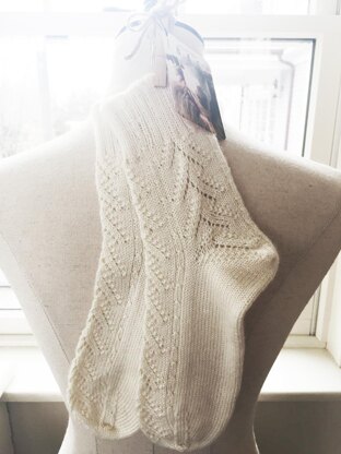 This is a unique sock pattern which offers three versions with different yarn weights. Directions are written for Ladies Medium in either lace, fingering or sport weights, but can be adjusted simply by choosing a heavier yarn for a larger sock, or a lighter yarn for a smaller sock. The leg and foot are also adjustable by changing the number of repeats in the lace pattern. Comprehensive charts for all yarn weights are included, as well as written instructions. The attractive shadow-wrap heel is smooth and seamless and offers a comfortable fit. Knit in the round on double-pointed needles, cuff down, it's a lovely, relatively quick pattern challenging enough for an advanced knitter, but detailed enough for a new learner. Between 300 and 400 yards total of yarn are required for both socks, depending on the yarn weight chosen and the height of the leg and length of the foot.