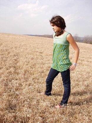 Linea is a lacy summer top. Fabric knit from bamboo yarn has a lovely drape. The elastic in the Esprit yarn adds stability to the bodice, which is knit at a tight gauge for the yarn. The armhole depth and shoulder straps are designed to allow a bra or camisole to be worn underneath. The top is knit in one piece from the bottom up.
