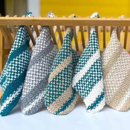 This Linen Dishcloth Set Knitting Pattern creates beautiful woven pieces with a 2-color change motif. This flat piece is perfect for washing since it dries quickly with cotton yarn. It’s easily memorizable project with a 2-row repeat stitch pattern. Choose among 3 different sizes and get creative mixing and matching your yarn colors!