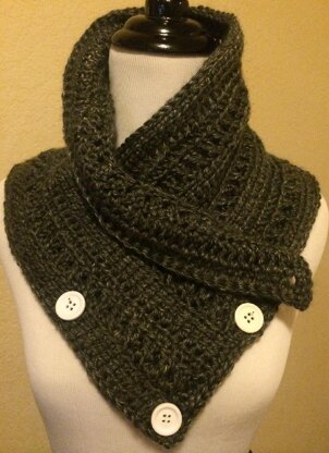 Materials Used: • 1 5oz./251 yd skein Lion Brand Heartland Tweed (10 ply Aran weight 100% acrylic) • http://yarnsub.com/yarns/lion_brand/heartland • N (10mm) Crochet Hook • Tapestry Needle, Scissors • 1 – 6 Large Buttons ¾” to 1” (2 buttons per fastening for “Cowl Links”) Make sure they will fit through gaps between your sets of 2 fpdc stitch sets
