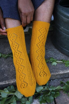 The socks have front and back panels featuring a diamond lace pattern and side ladders lace pattern. The socks knitted in fingering weight Amble yarn from The Fibre Co. have a traditional heel- flap and gusset heels and are knit cuff-down, starting with a 2x1 rib. Separate charts and instructions are written for each size to make it easier to follow the pattern.