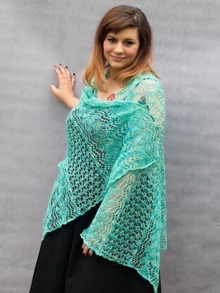 An airy romantic-style lace shawl that is easy to knit in a quite "other" way of construction. You start with knitting the first border, pick up sts from the long side afterwards to work the center and - at last - knit the second border directly to the center again.