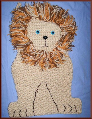 This was fun to make up, designed when someone was looking for a stocking in the shape of a lion. The body is crocheted in the round in one piece, the face is crocheted separately and stuffed lightly when attaching to face. The fringe took awhile, but I do like the effect, so feel the time spent was well worth it: worsted weight yarn, with the plies separated!