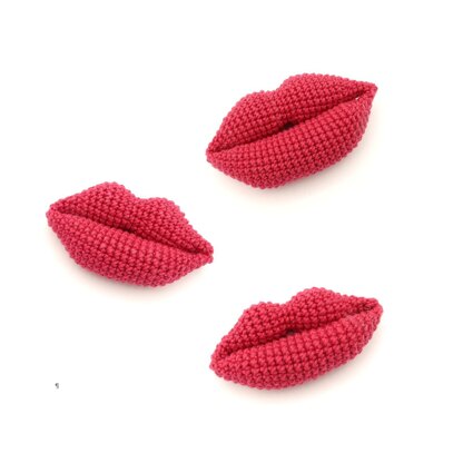 MEASUREMENTS With the yarns used in this project, the big lips measure 5.5 cm tall and 10 cm wide, the medium lips measures 4.5 cm tall and 8.5 cm wide and the small lips measure 4 cm tall and 7.5 cm wide.