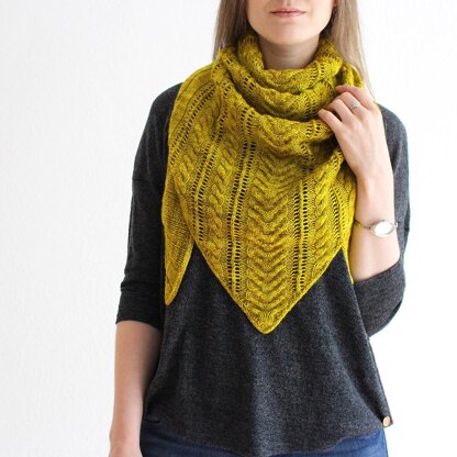 This beautiful triangular shawl features an eyecatching cable-lace panel in the centre. Worked in fingering weight yarn in your favourite colour it creates a stunning item to highlight your daily wardrobe that you‘ll love to knit and wear!