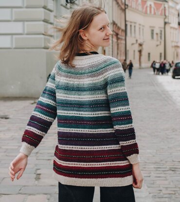 Lithriad is a top-down seamless yoke sweater that is knit in the round. There is a ribbed neckline followed by short rows at the back of the neck for a comfortable fit. There is a repeated slip stitch motif all the way down the sweater. There is never more than one colour used in each round, so knitting Lithriad is simple to work, but creates effective textured colorwork. This pattern includes alternatives for short sleeves, long sleeves, as well as a steeked cardigan.