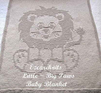 Little ~ Big Paws is not to be feared, this cute lion loves everyone. It will delight small toddlers and babies alike when they snuggle with its’ little ~ big paws and happy eyes. This lion blanket is 36” by 48” and knitted with Loops & Threads ~ Charisma on 13 US circular needles with a 24” cable. The adorable lion covers more than half of the blanket making it a fun, loving blanket for cribs or throws for babies and small toddlers alike. This blanket has step by step instruction and only has knit and purl stitches making it terrific for all. It is written in English ONLY.