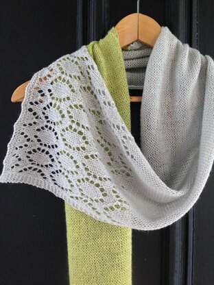 Little Birches is narrow rectangular shawl with lacy edges worked in two colors. This soft yet crisp wrap is easy to wear across your shoulders to keep out the winter chill. It looks equally pretty looped loosely around the neck with its lacy ends in two different colors draping softly toward the front. At 10″ wide, Little Birches is wide enough to be a wrap, and airy enough to be a scarf. The leafy lace edges make for some knitting fun while the stockinette portion is perfect for car or commute knitting.